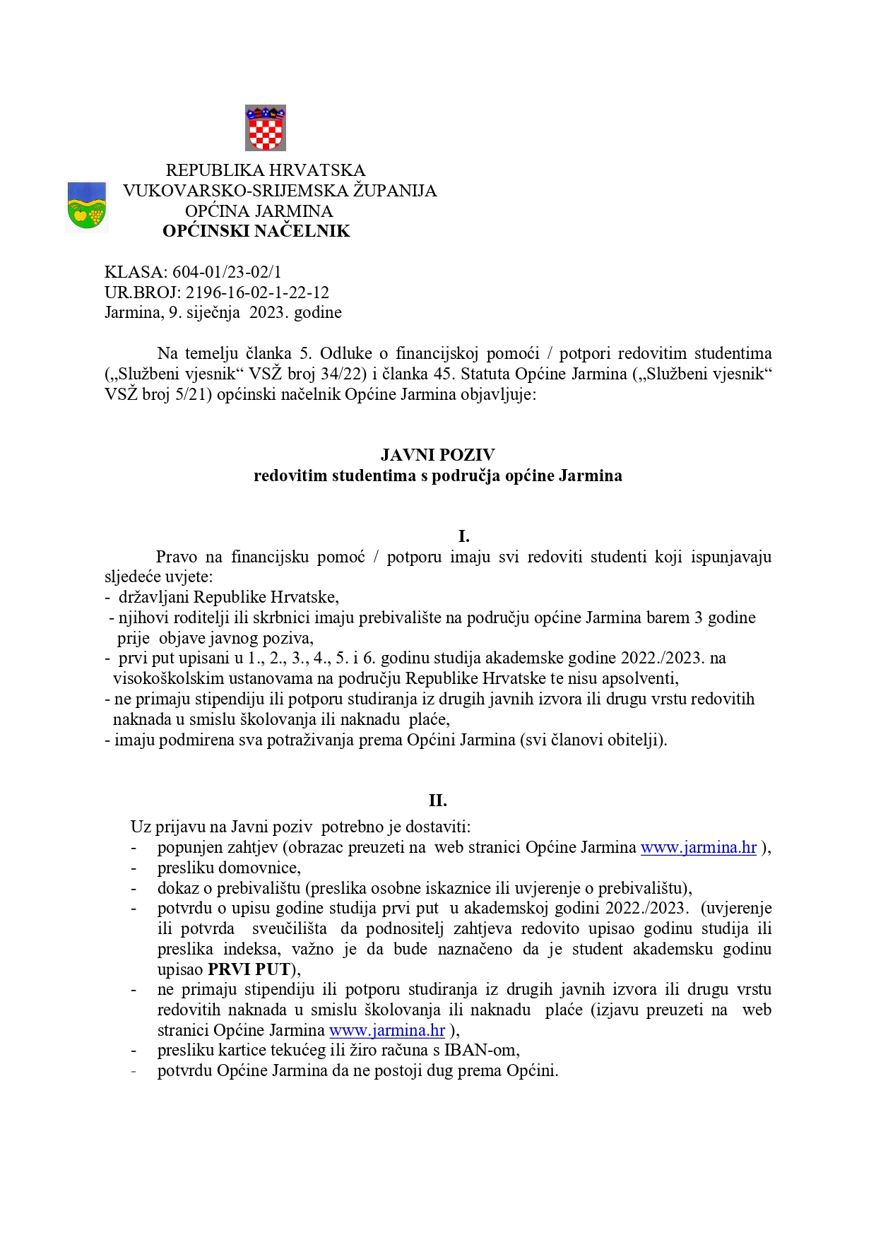 9 siječnja, 2023 Općina Jarmina Uncategorized No Comments ZAHTJEV IZJAVA Javni poziv, Zahtjev i Izjavu možete preuzeti i u rubrici Politika i rad… Natječaji-Javni pozivi