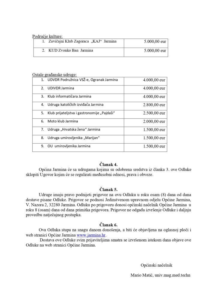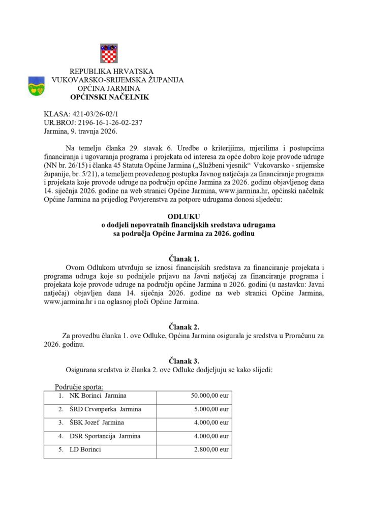 Odluka o dodjeli nepovratnih financijskih sredstava udrugama sa područja Općine Jarmina za 2026.god.